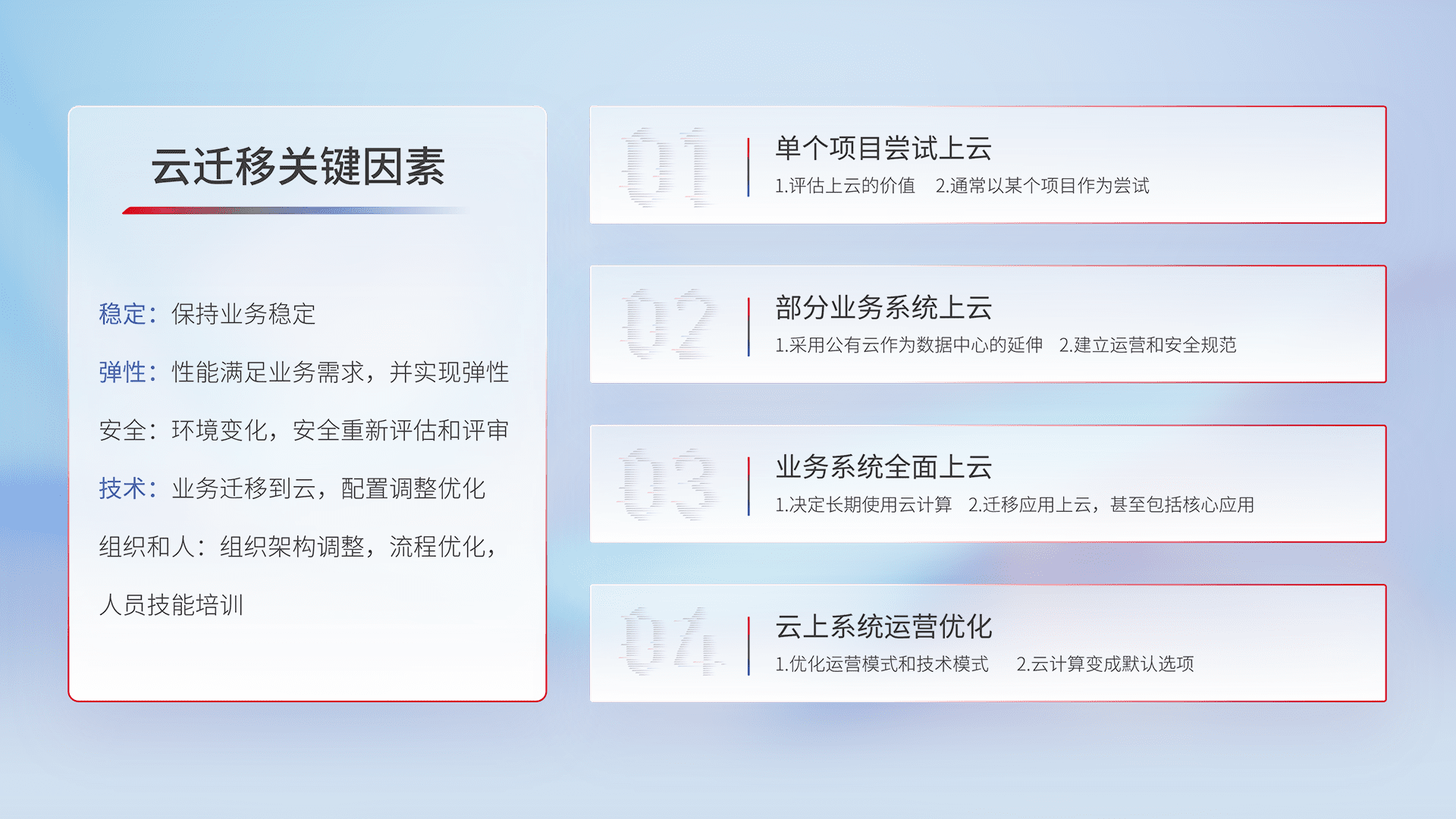 结合实际业务,,,从规划设计、、、云平台选型、、云原生改造、、、数据迁移、、、集成交付,,迁移全过程为客户识别最佳上云路径,,,,做好风险识别管理,,,设计网络架构、、身份权限、、安全审计合规、、、、操作审计、、、、日志审计、、、、监控告警策略、、、多站点容灾设计等,,对云上基础设施进行整体规划,,,,提升IT治理水平,,,,以满足弹性、、高可用、、、高性能的需求。。